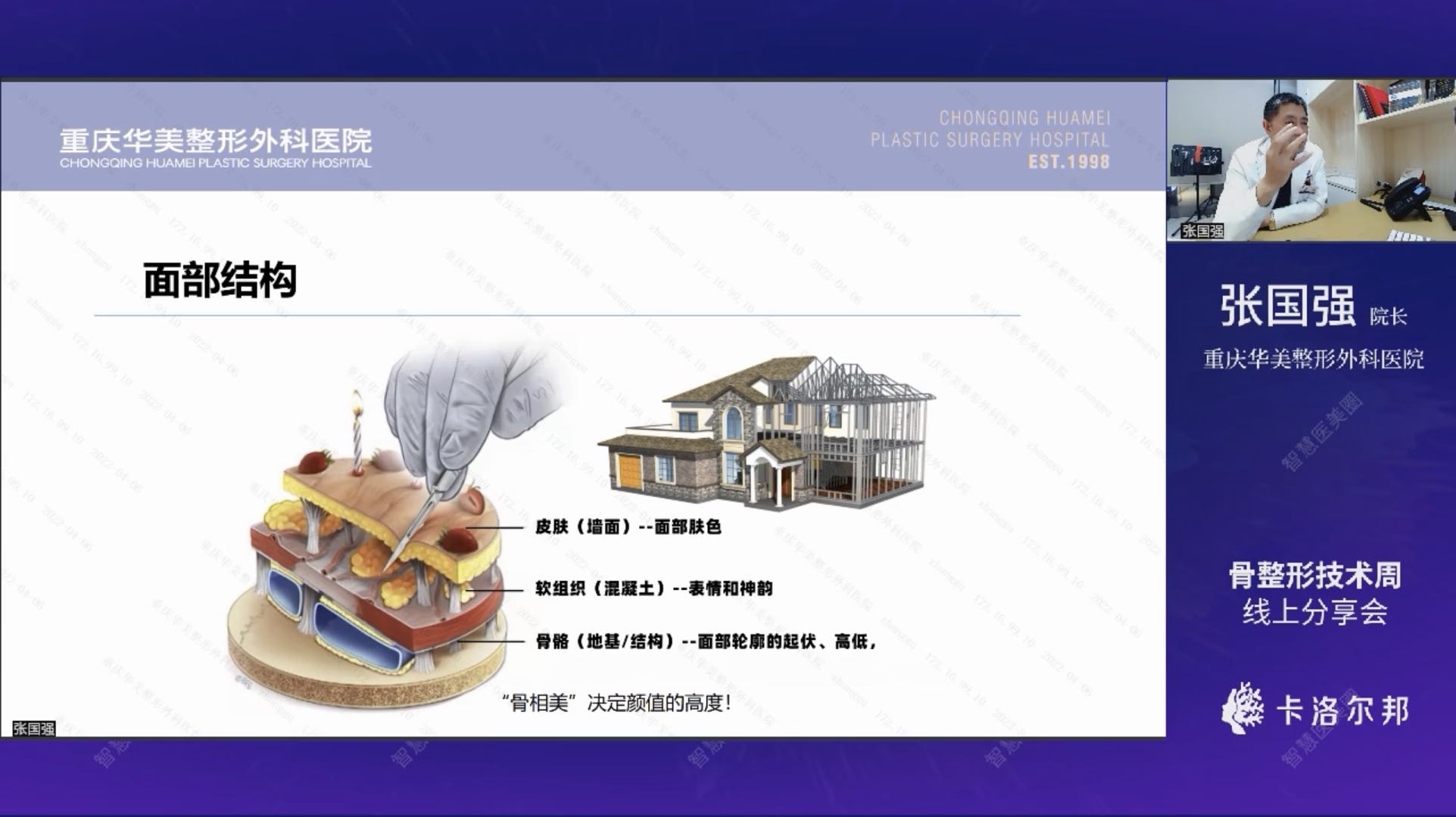 现阶段的国际流行审美趋势,东方美人更强调骨性质感。针对面部的结构分层,张国强院长用了一个生动有趣的比喻,帮助与会的观众理解骨相美学及其影响外貌表现力差异缘由:如果将颅面结构比作房子,那么三个层次结构则分别是皮肤≈墙面,主要呈现面部肤色;软组织≈混凝土,传达表情和神韵;而骨骼≈地基/结构,呈现面部轮廓的起伏高低,因此,骨相美是影响颜值的重大要素。