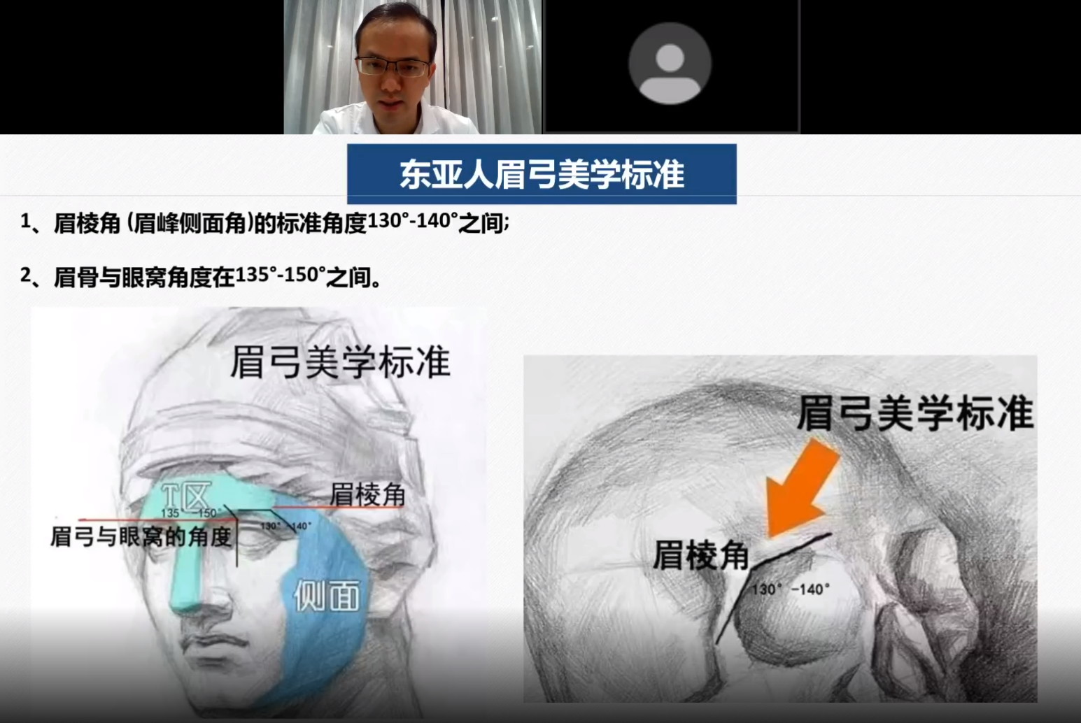 吴灿院长就“东亚人眉弓美学标准”展开讲解,东亚人和欧美人的眉弓是不一样的,东亚人是有适合自己的一个眉弓美学的标准,在他从业以来做过的眉弓填充手术和研究眉弓的美学角度来看,东亚人的眉弓要注意的两个地方,一个是眉棱角、另一个是眉骨以及眼窝的角度。眉棱角 (眉峰侧面角)的标准角度130°-140°之间,眉骨与眼窝角度在135°-150°之间,做眉弓填充手术要在手术过程中把这两个角度做出来,除此之外,还要与鼻梁、额头做整体的适配度设计,才能达到求美者想要的眉弓美学的效果。